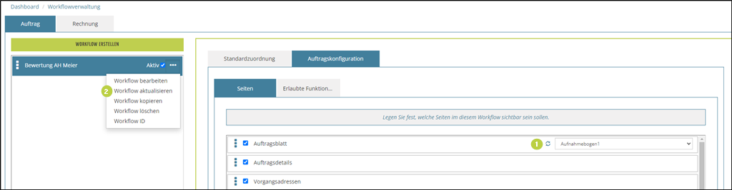Nutzen Sie dafür den Button AUFTRAGSBLATT AKTUALISIEREN (1) oder die Funktion „Workflow aktualisieren“ (2) im 3-Punkte Menü des Workflows.