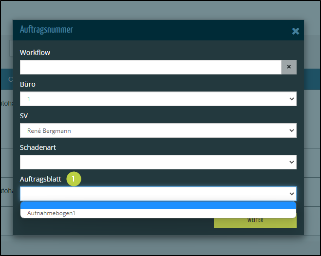 Wenn Sie „eigene Eingabemasken“ definiert haben, werden diese bei der Auftragsanlage zur Auswahl angeboten (1). Andernfalls werden die Aufträge ohne eine „eigene Eingabemaske“ angelegt.