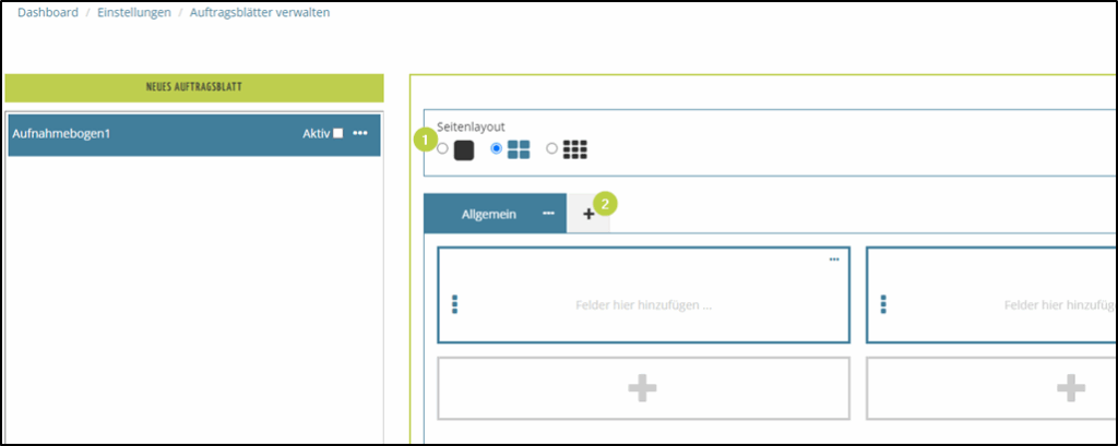 Im zweiten Schritt empfehlen wir Ihnen die Tab-Struktur zu definieren. Mit Klick auf den Button (2) können Sie einen weiteren Tab der Eingabemaske hinzufügen.