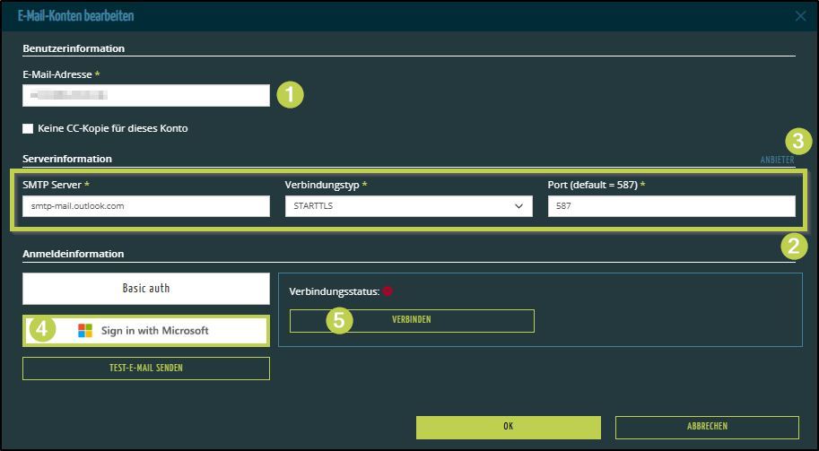 Der Verbindungsstatus wird mit einem grünen Punkt symbolisiert (1). Anschließend können die Einstellungen über den Button TEST-E-MAIL SENDEN (2) prüfen.