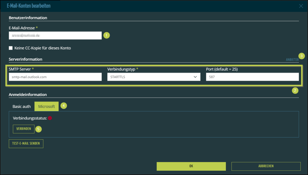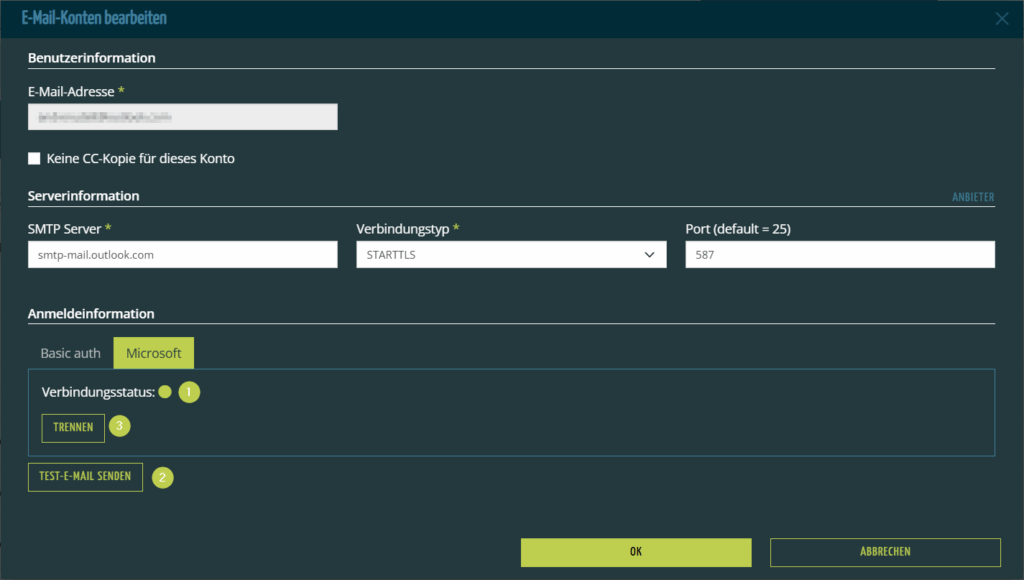 Der Verbindungsstatus wird mit einem grünen Punkt symbolisiert (1). Anschließend können die Einstellungen über den Button TEST-E-MAIL SENDEN (2) prüfen.