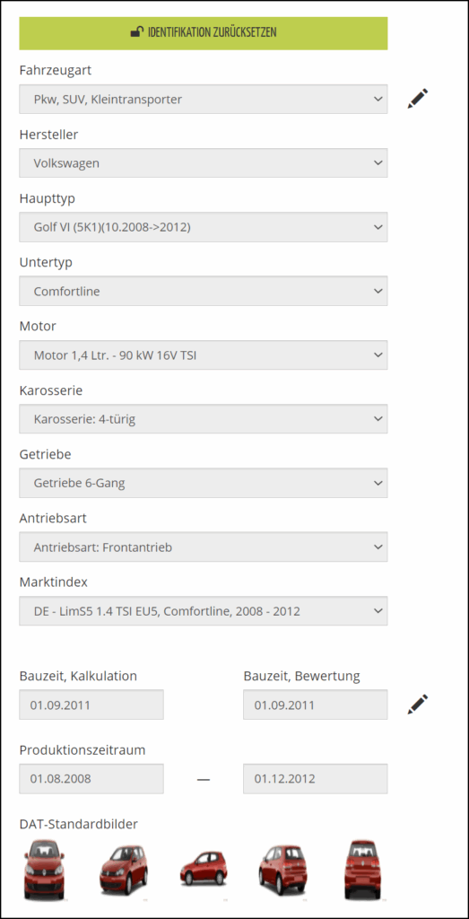 Auch hier wird nach vollständig getroffenen Auswahlen das Fahrzeug eingetragen, und die DAT-Standardbilder werden geladen.