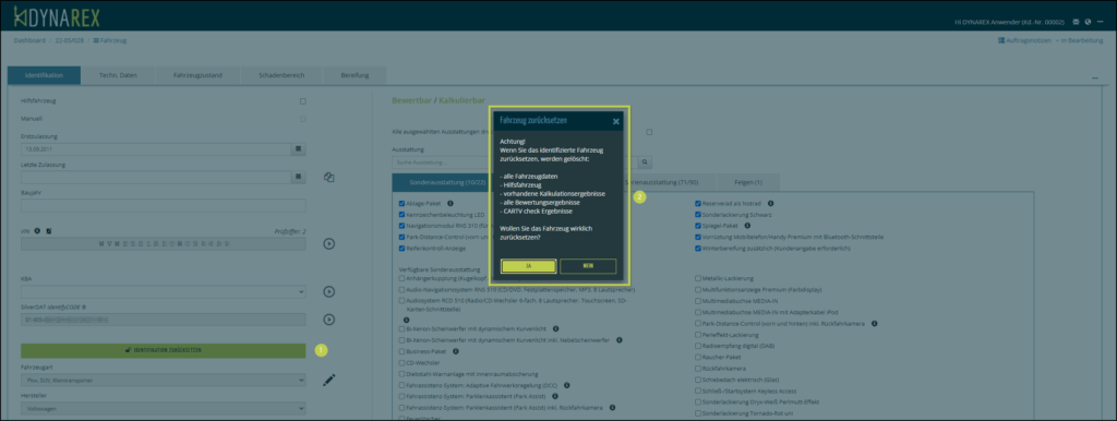 Um weitere Varianten der Fahrzeugidentifikation zu zeigen, setze ich das Fahrzeug über den Button IDENTIFIKATION ZURÜCKSETZEN (1) zurück. Dabei werden alle Fahrzeugdaten, eventuell durchgeführte Kalkulationen, Bewertungen, Restwertanfragen oder Marktwertanalysen zurückgesetzt (2).
