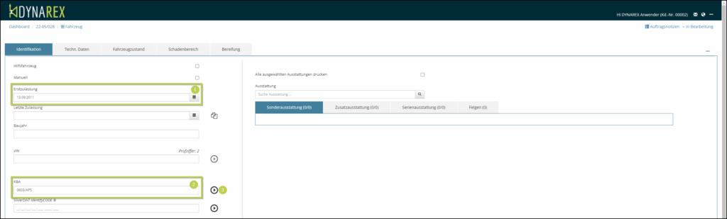 Erfassen Sie die Erstzulassung (1) sowie die KBA-Nummer (2) und klicken Sie auf das Play-Symbol (3).