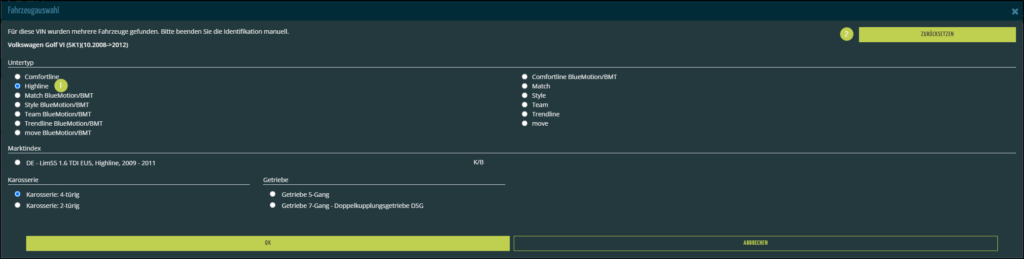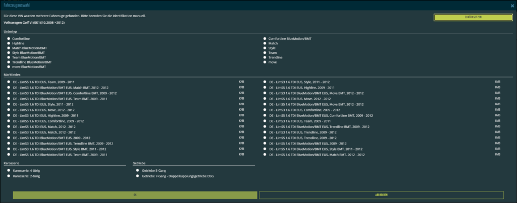 Ohne eine Auswahl zu treffen, kann der Dialog nicht mit OK bestätigt werden und somit wird auch die Fahrzeugidentifikation nicht abgeschlossen.