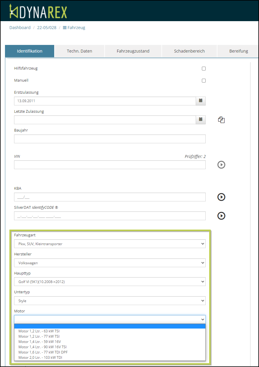 Auch hier wird nach vollständig getroffenen Auswahlen das Fahrzeug eingetragen, und die DAT-Standardbilder werden geladen.