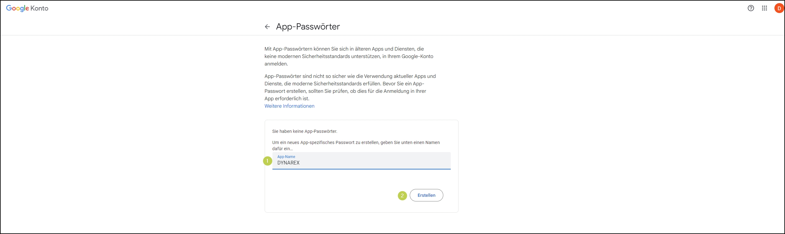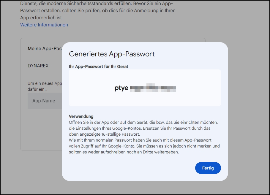 G-Mail Accounts können in DYNAREX nur noch genutzt werden, wenn die 2-Faktor Authentifizierung aktiviert ist und man ein individuelles App-Passwort für DYNAREX generiert.