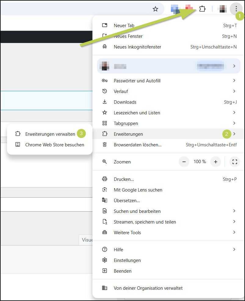 Gehen Sie in die Erweiterung von Google Chrome. Klicken Sie dazu auf das Erweiterungs-Symbol oder über das 3 Punkte zu den Erweiterungen -> Erweiterungen verwalten.