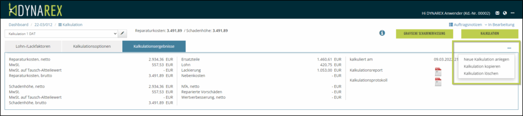 In DYNAREX können Sie in einem Auftrag mittels Klick auf das Drei-Punkt-Menü Neue Kalkulation anlegen, Kalkulation kopieren, oder Kalkulation löschen.