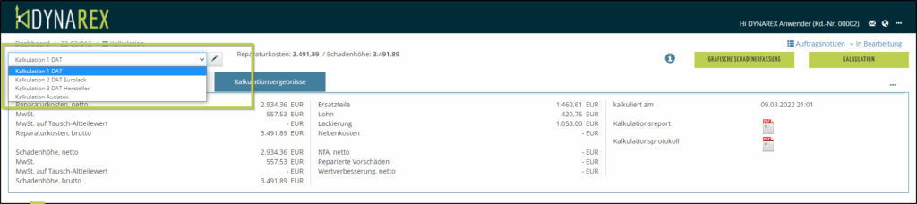 Welche Kalkulation samt Ergebnissen im Gutachten verwendet wird, entscheiden Sie über die Auswahl im linken oben Bereich.