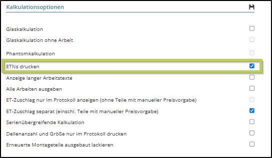 Aktivieren Sie die Option ETNs drucken, damit Ihre erfassten Ersatzteilnummern gedruckt werden.