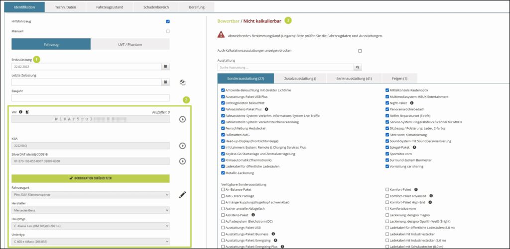 - Identifizieren Sie das Fahrzeug per VIN, KBA, SilverDAT identifyCODE oder manuell.