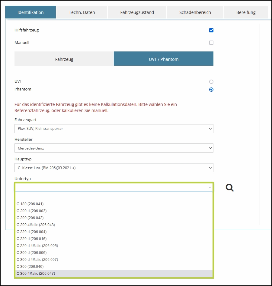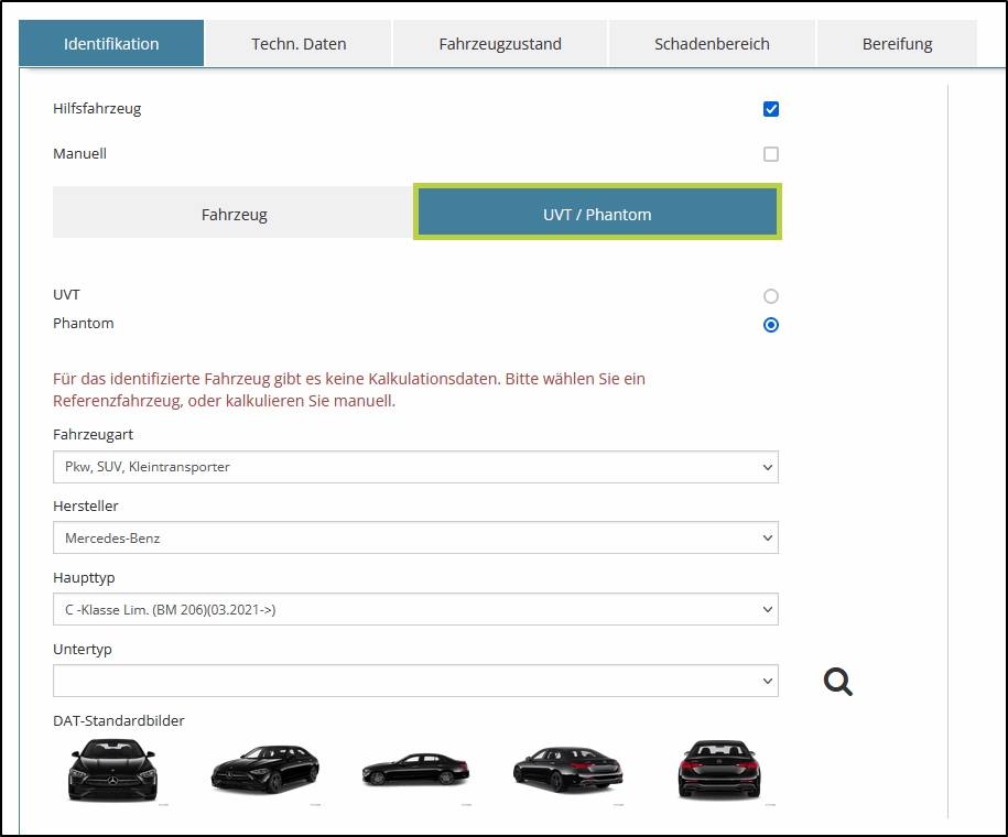Mit Klick auf UVT / Phantom öffnet sich die Maske, in welcher Sie das Referenz-Fahrzeug manuell auswählen.