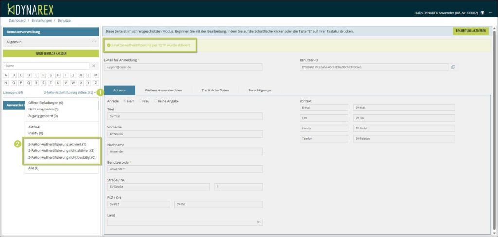Wenn Sie das Recht der Benutzerverwaltung haben, können Sie über einen Filter (1) erkennen, welche der eingerichteten Benutzer diese Sicherheitsvariante (2) aktiviert haben.