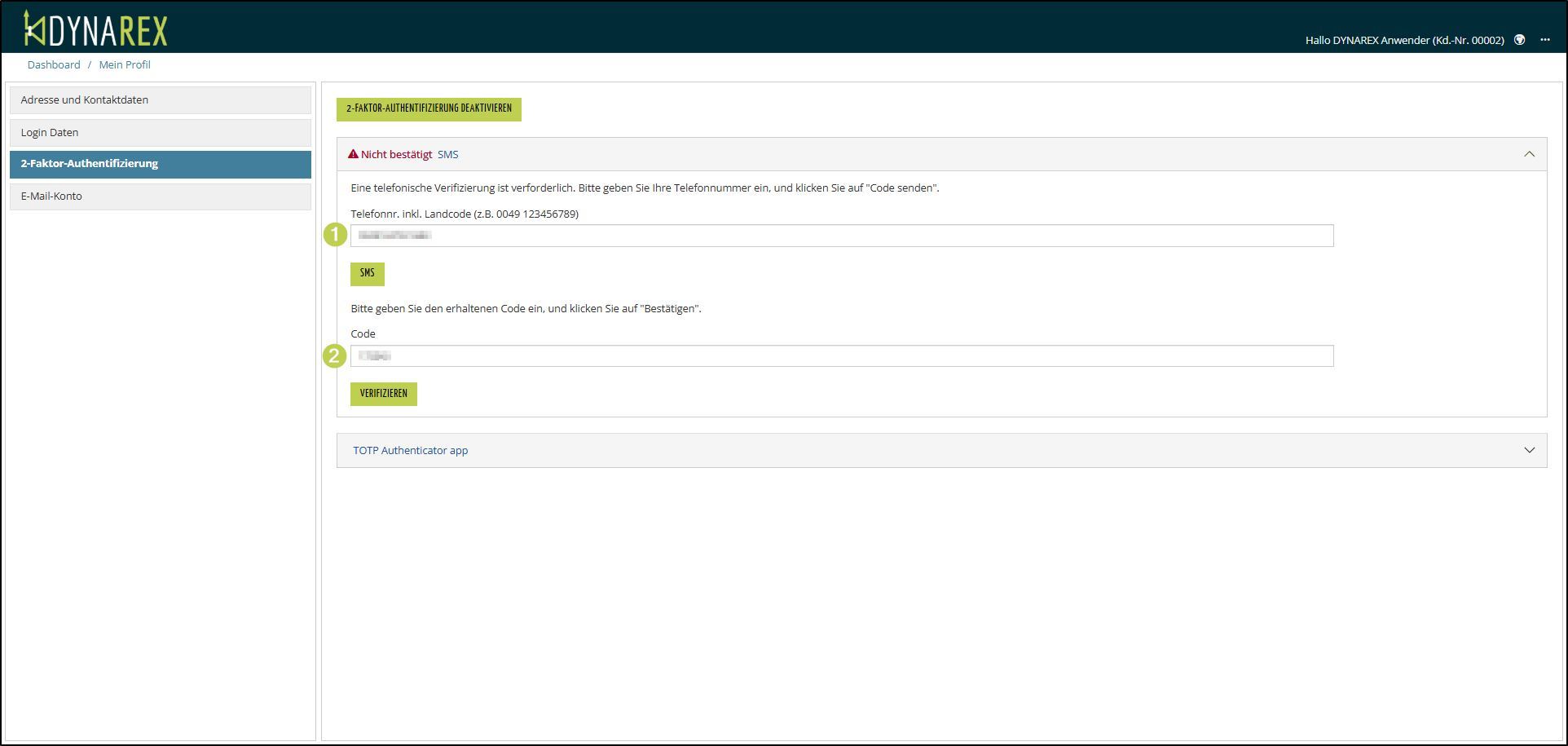 Nach der Aktivierung müssen Sie hier Ihre Mobilfunknummer (1) eintragen und den Bestätigungscode (2), welcher per SMS zugesandt wird, erfassen und BESTÄTIGEN.