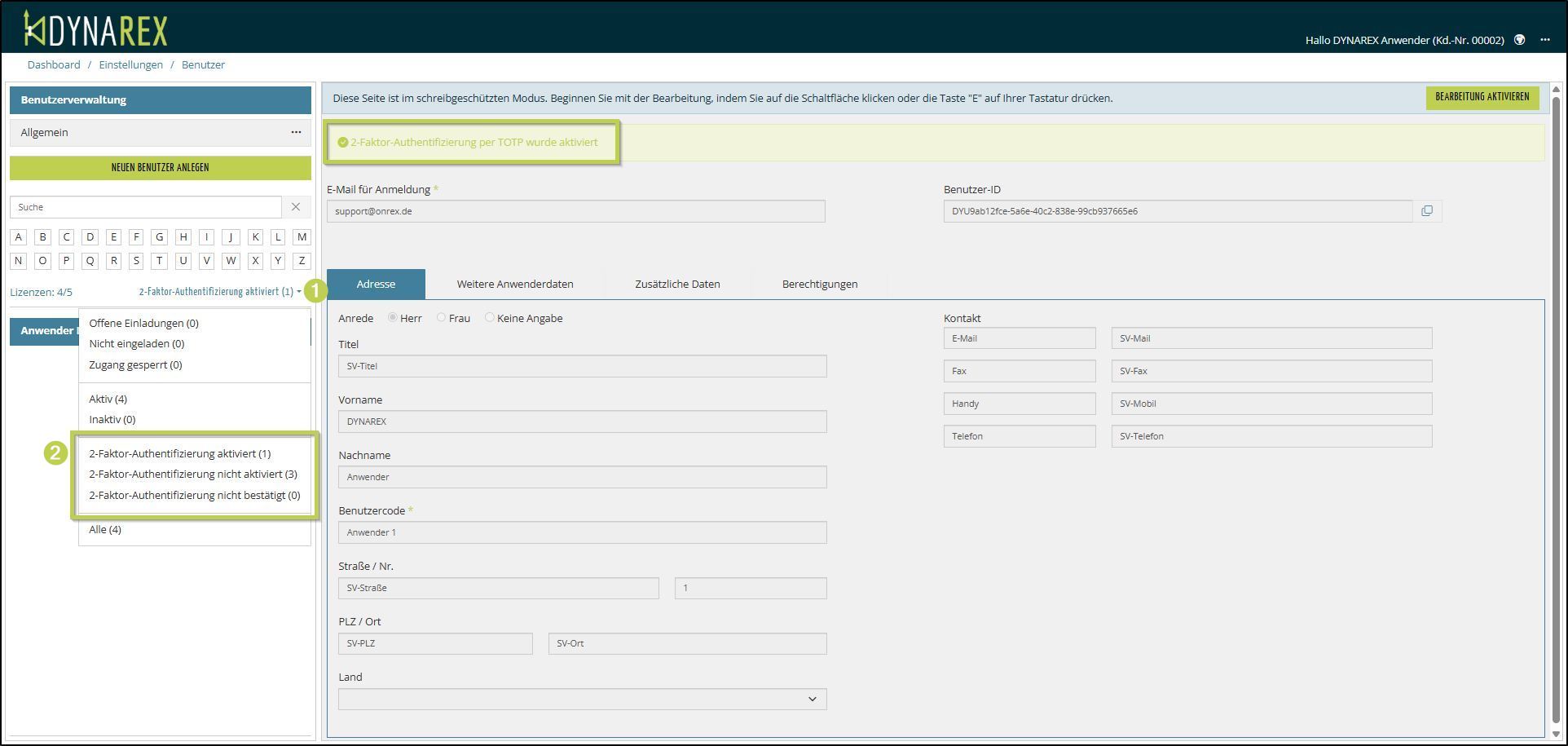 Wenn Sie das Recht der Benutzerverwaltung haben, können Sie über einen Filter (1) erkennen, welche der eingerichteten Benutzer diese Sicherheitsvariante (2) aktiviert haben.