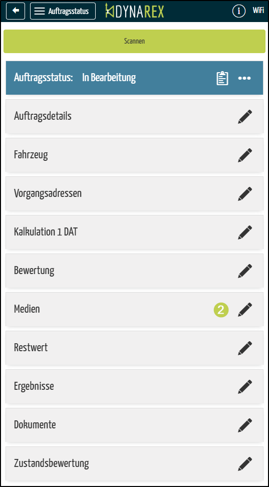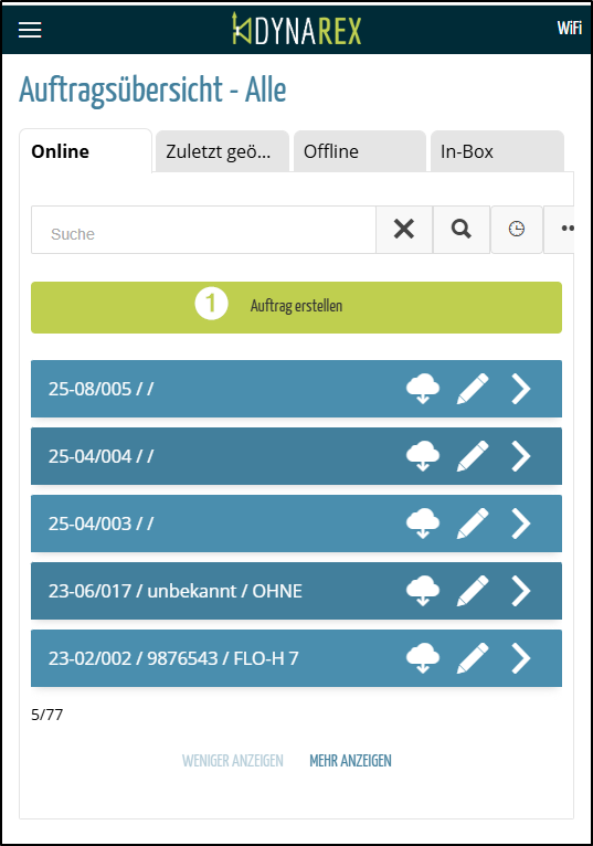 Öffnen Sie dazu Ihre DYNAREX / SilverDAT3 Expert App (iOS oder Android) und erstellen Sie einen neuen Auftrag (1) oder öffnen Sie einen vorhandenen Auftrag: