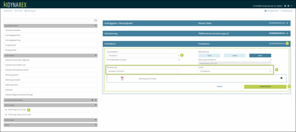 - Klicken Sie auf DOKUMENTE ERZEUGEN (5) um den Versand abzuschließen