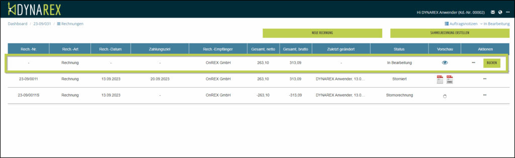 - Die Rechnungsübersicht aktualisiert sich und Sie sehen die neue Rechnung zur Bearbeitung sowie die Stornorechnung und die stornierte Rechnung als PDF-Dokument. Durch Klick auf die entsprechende Zeile sehen Sie zusätzlich auch die erfassten Daten.