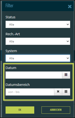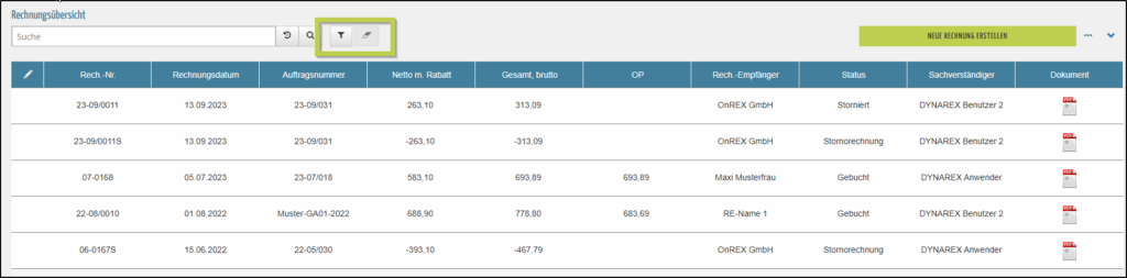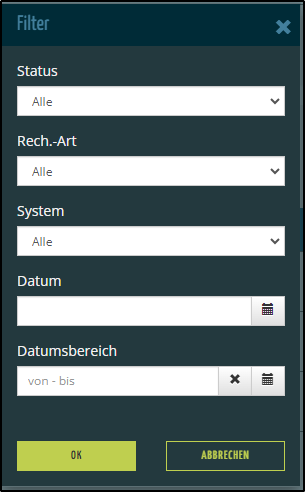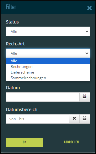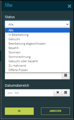 - Hier können Sie beispielsweise nach Status oder Rechnungsart filtern