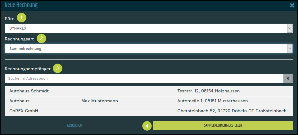 - Rechnungsempfänger = Wählen Sie mittels Suche im Adressbuch den Rechnungsempfänger der Sammelrechnung