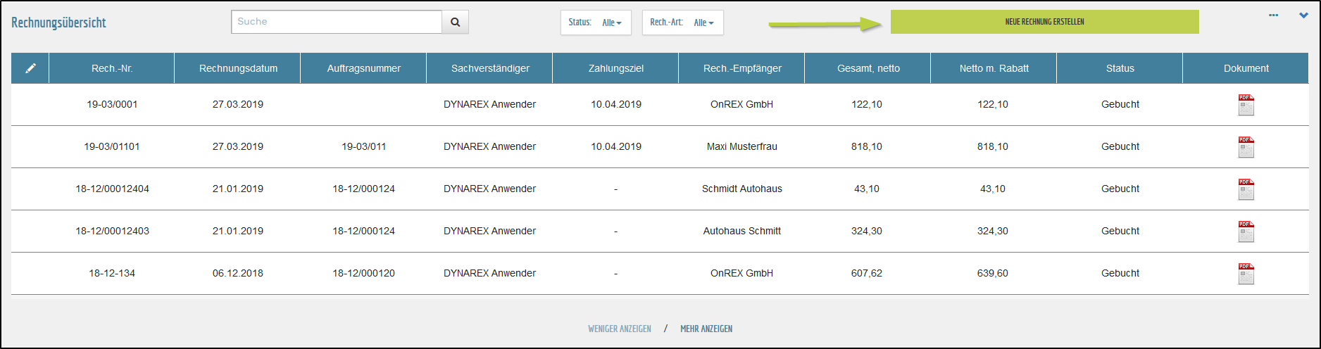 Erstellen Sie direkt über das Widget Rechnungsübersicht eine neue Rechnung /Sammelrechnung ohne Auftrag: