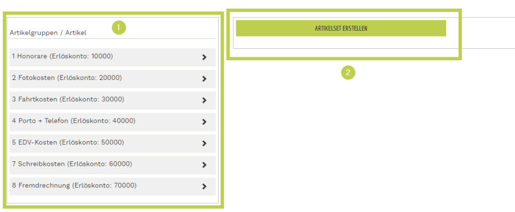 - hier sehen Sie im linken Bereich Ihre vorhandenen Rechnungsartikel und Sie können im rechten Bereich neue Artikelsets erstellen