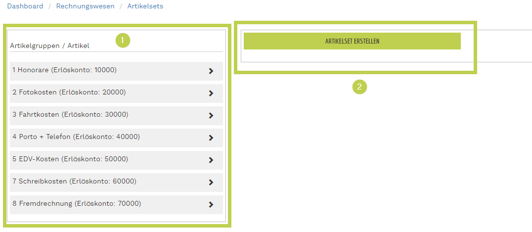 - hier sehen Sie im linken Bereich Ihre vorhandenen Rechnungsartikel und Sie können im rechten Bereich neue Artikelsets erstellen