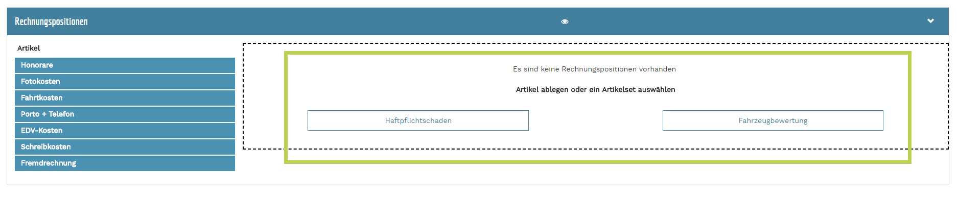 - im unteren Bereich bei den Rechnungspositionen sehen Sie Ihre definierten Artikelsets, wobei Sie das gewünschte Set mit einem Klick aktivieren können