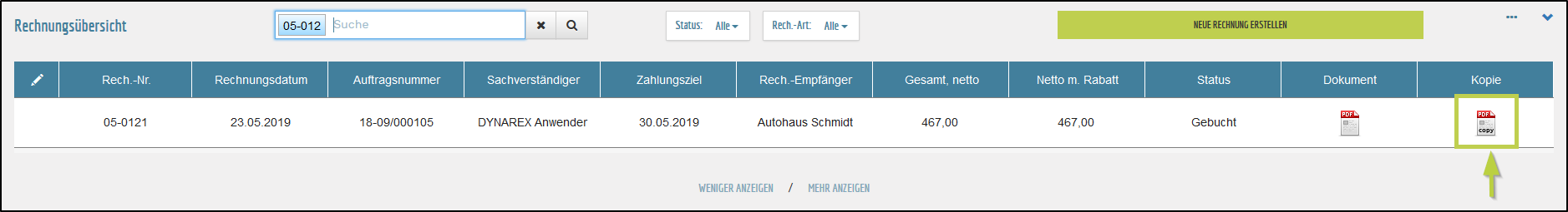 Des Weiteren können Sie in der Rechnungsübersicht über das 3-Punkte Menü das Rechnungsduplikat/-kopie einblenden.