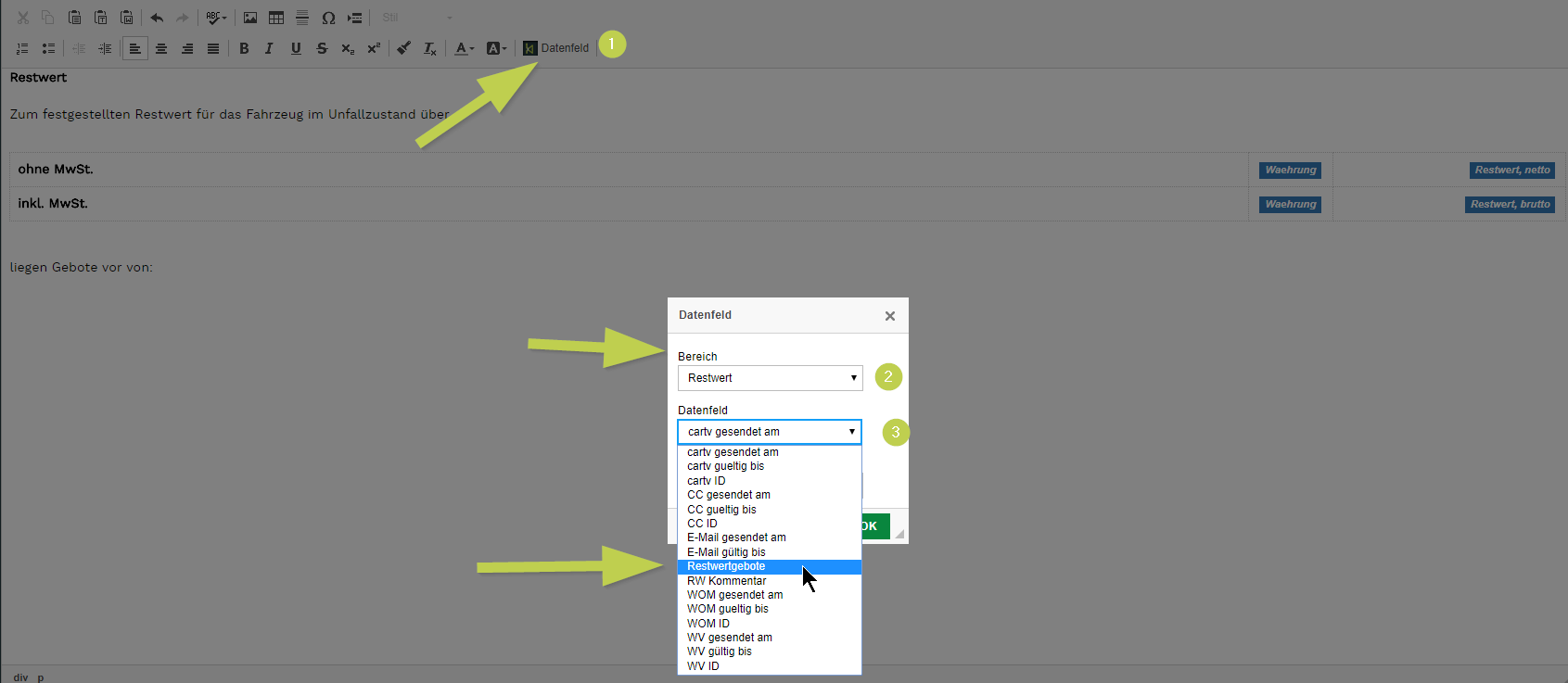 Öffnen Sie dazu (am besten gleich in den Textstammdaten) Ihren gewünschten Baustein und für Sie das Datenfeld Restwert – Restwertgebote hinzu.