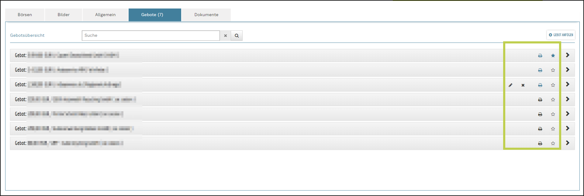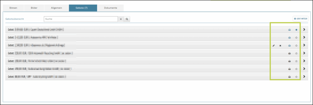 Die Gebote werden übersichtlich in der Gebotstabelle dargestellt und sind nach dem Preis sortiert.