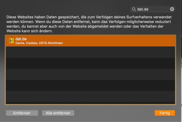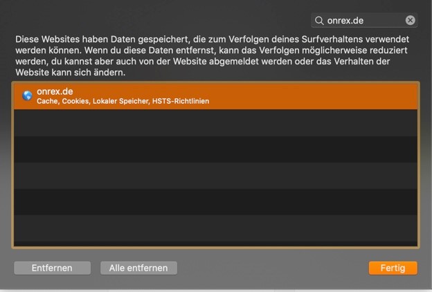 Nutzen Sie die Suche oben rechts und Suchen Sie nach onrex und dat, um explizit diese Cookies zu entfernen.