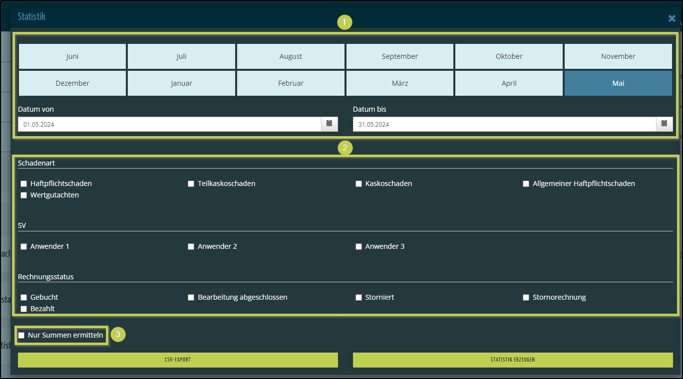 Der Datumsbereich (1) ist mit dem aktuellen Monat vorausgefüllt und kann manuell überschrieben bzw. über die Schnellauswahl neu selektiert werden.