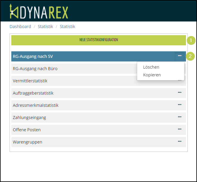 Neue Statistiken können Sie über den entsprechenden Button (1) erstellen, existierende Statistiken über das 3 Punkte Menü (2) kopiert oder gelöscht werden.