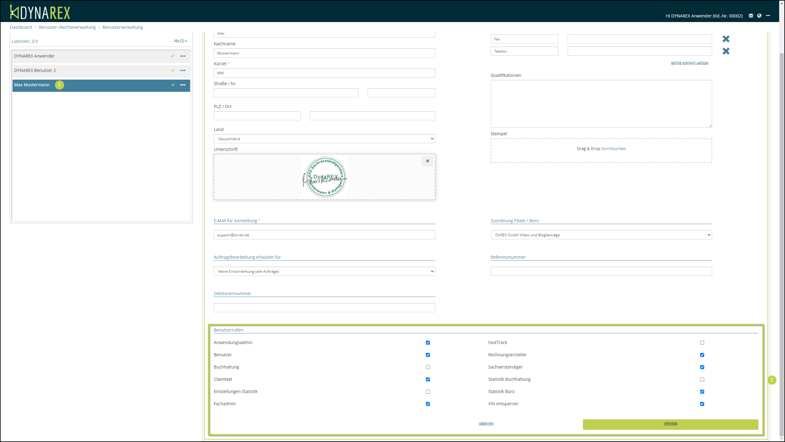 Selektieren Sie den gewünschte Anwender (1) und ordnen Sie diesem die entsprechenden Rollen zu.