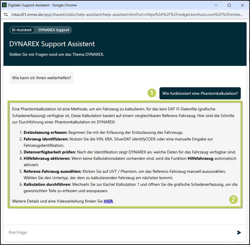 Auf meine Beispielfrage „Wie funktioniert eine Phantomkalkulation?“ (1) wird Ihnen die Vorgehensweise angezeigt (2)