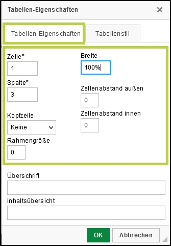 Durch Klick auf OK wird eine Tabelle mit 3 gleichmäßig verteilten Spalten eingefügt.