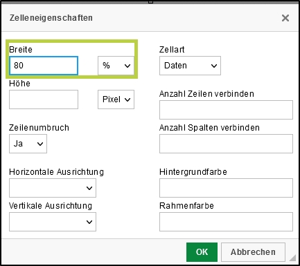Im folgenden Dialog setzen Sie die Breite auf 80 % und bestätigen Sie mit OK.