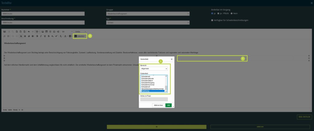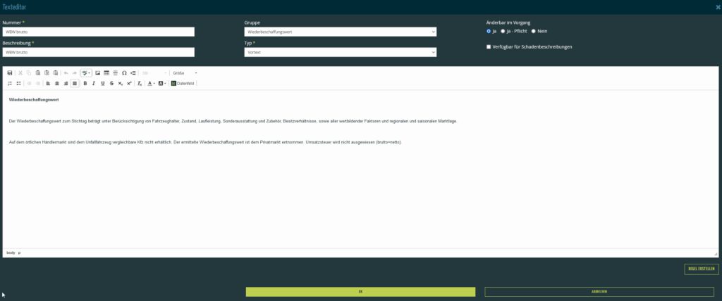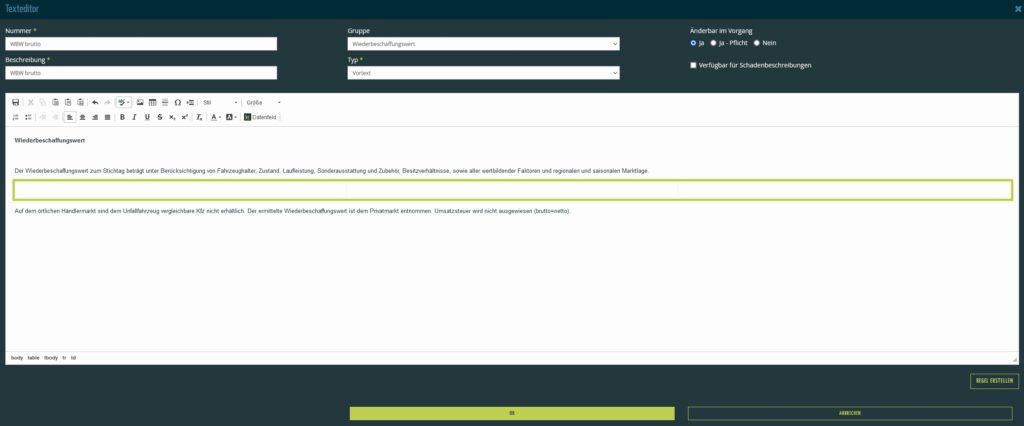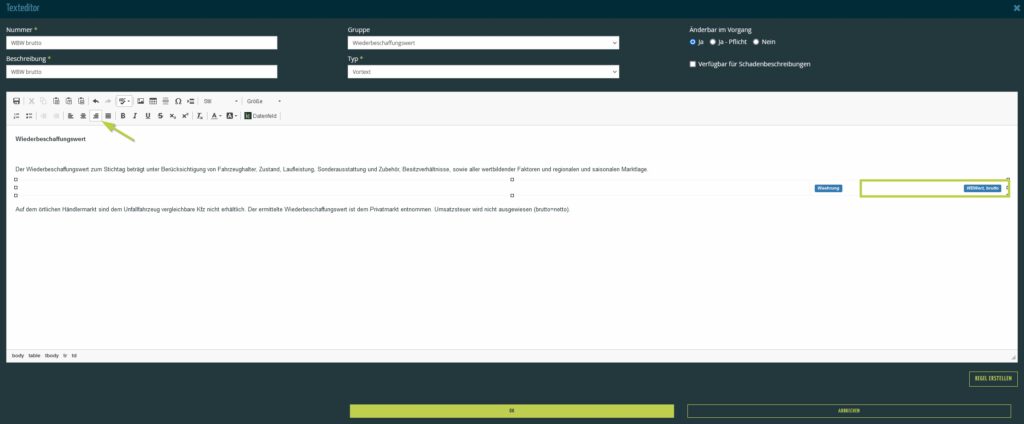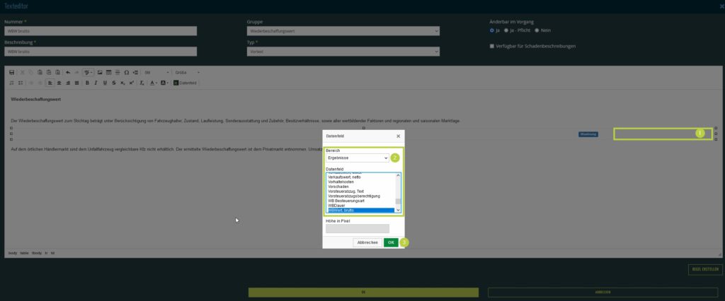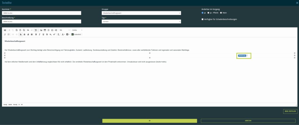 In diesem Beitrag zeigen wir Ihnen, wie man einen Baustein mit Ergebnisfeldern und Text (am Beispiel Wiederbeschaffungswert brutto) korrekt anlegt und formatiert.