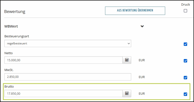 Wechseln Sie nun in einen Auftrag und stellen Sie sicher, dass in den Ergebnissen ein Brutto-Wiederbeschaffungswert erfasst ist. Der Haken „Druck“ steuert nur das Deckblatt und wird in unserem Beispiel nicht ausgewertet.