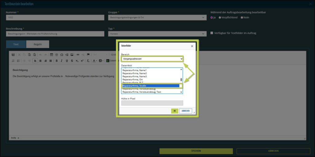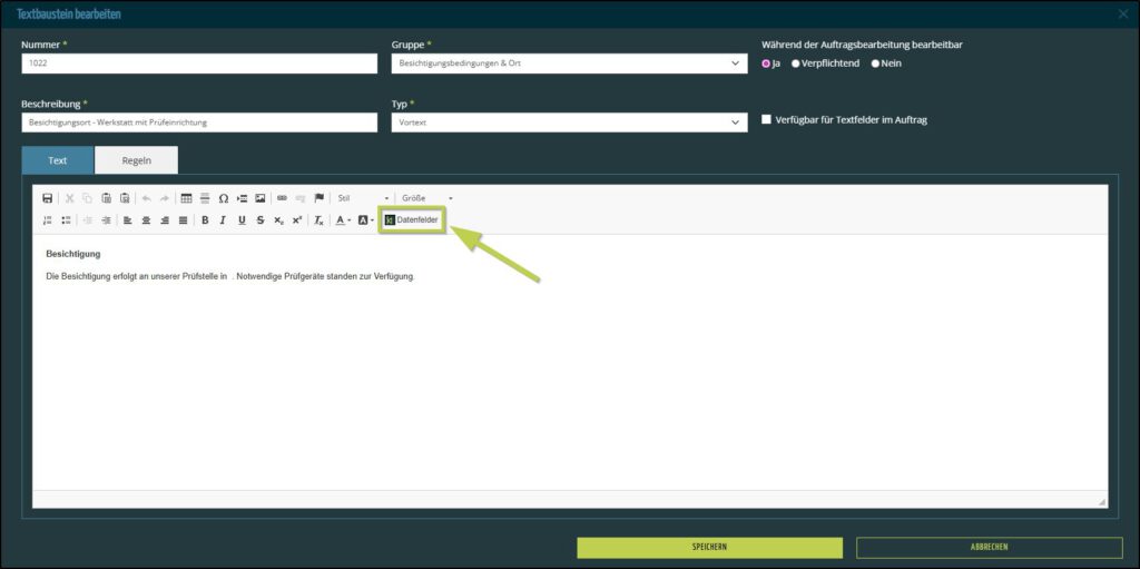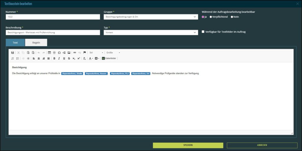 Wiederholen Sie das Einfügen der Datenfelder, bis Ihr Textbaustein vollständig ist und speichern diesen.