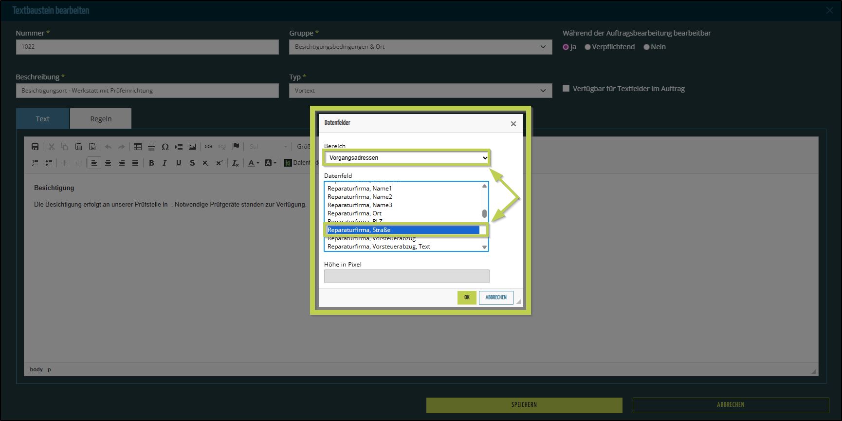 Wiederholen Sie das Einfügen der Datenfelder, bis Ihr Textbaustein vollständig ist und speichern diesen.