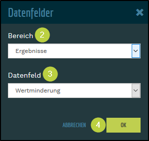 Klicken Sie auf DATENFELDER (1), wählen Sie sich das gewünschte Feld (2 und 3) für die Bedingung aus und bestätigen Sie den Dialog mit OK (4).
