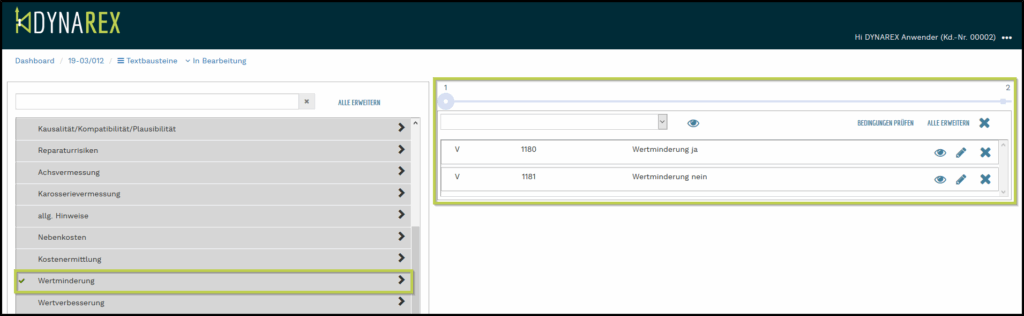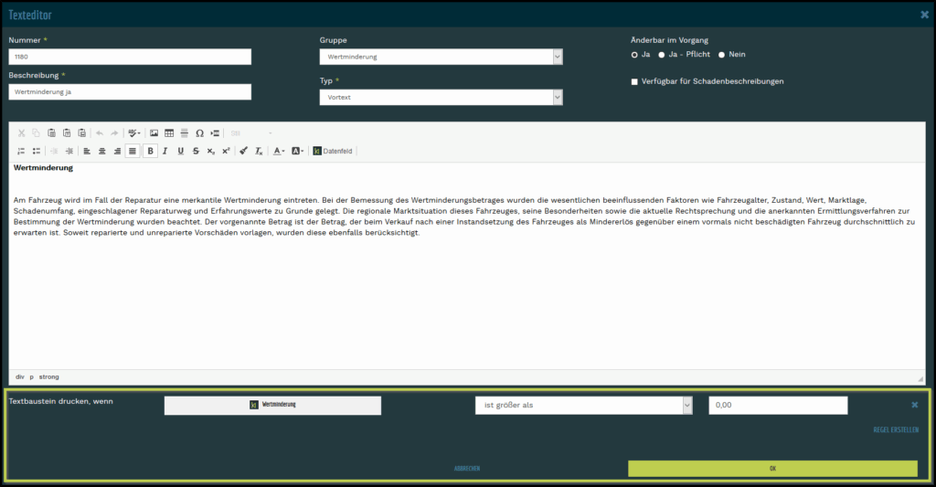 In diesem Beitrag erklären wir Ihnen, wie Sie Bedingungen für Textbausteine (hier am Beispiel der Wertminderung) erstellen können.