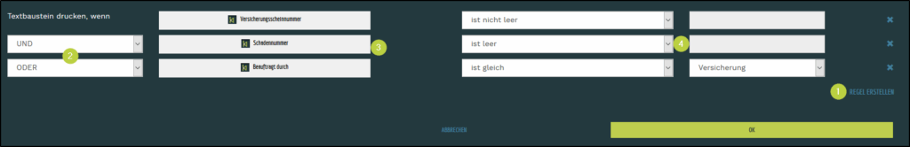 Klicken Sie dazu einfach erneut auf REGEL ERSTELLEN (1), wählen Sie, ob es sich um eine UND oder ODER – Verknüpfung (2) handelt und anschließend die Felder (3) und Operatoren (4) aus.
