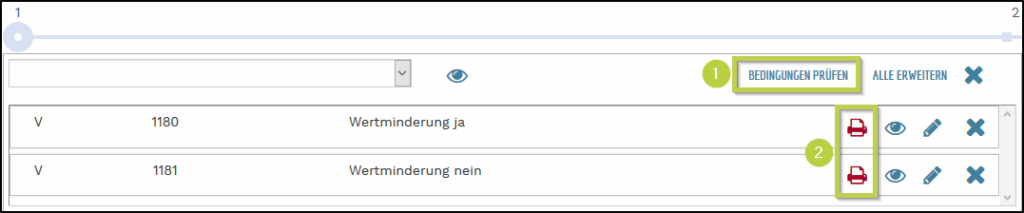 Durch Klick auf BEDINGUNGEN PRÜFEN wird Ihnen sofort durch ein grünes Druckersymbol angezeigt, welcher der beiden Bausteine im aktuellen Auftrag gedruckt wird.