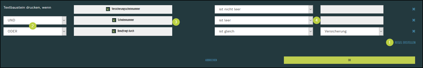 Klicken Sie dazu einfach erneut auf REGEL ERSTELLEN (1), wählen Sie, ob es sich um eine UND oder ODER – Verknüpfung (2) handelt und anschließend die Felder (3) und Operatoren (4) aus.