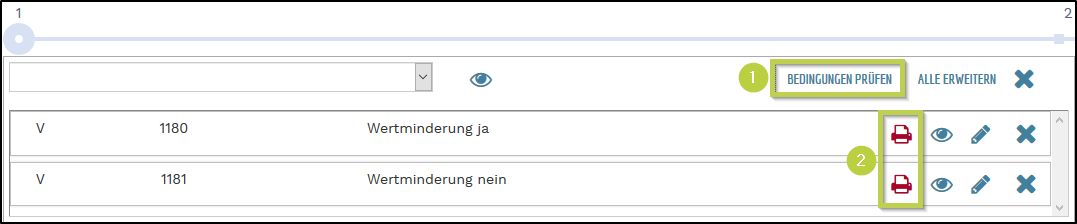 Durch Klick auf BEDINGUNGEN PRÜFEN wird Ihnen sofort durch ein grünes Druckersymbol angezeigt, welcher der beiden Bausteine im aktuellen Auftrag gedruckt wird.