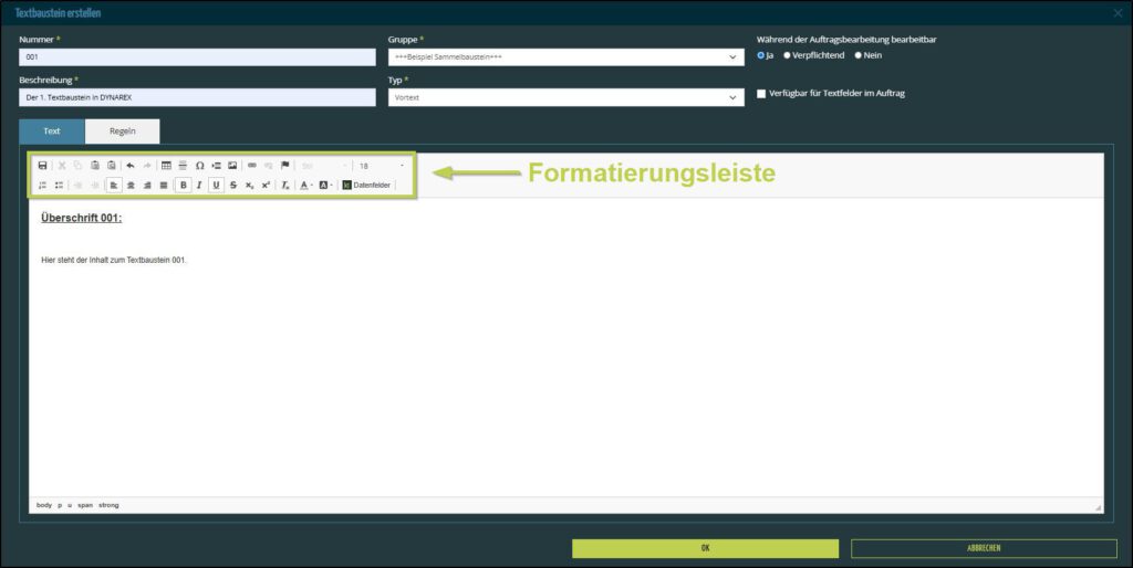Tipp: Achten Sie bei der Erfassung von Bausteinen bitte stets auf eine einheitliche Formatierung!